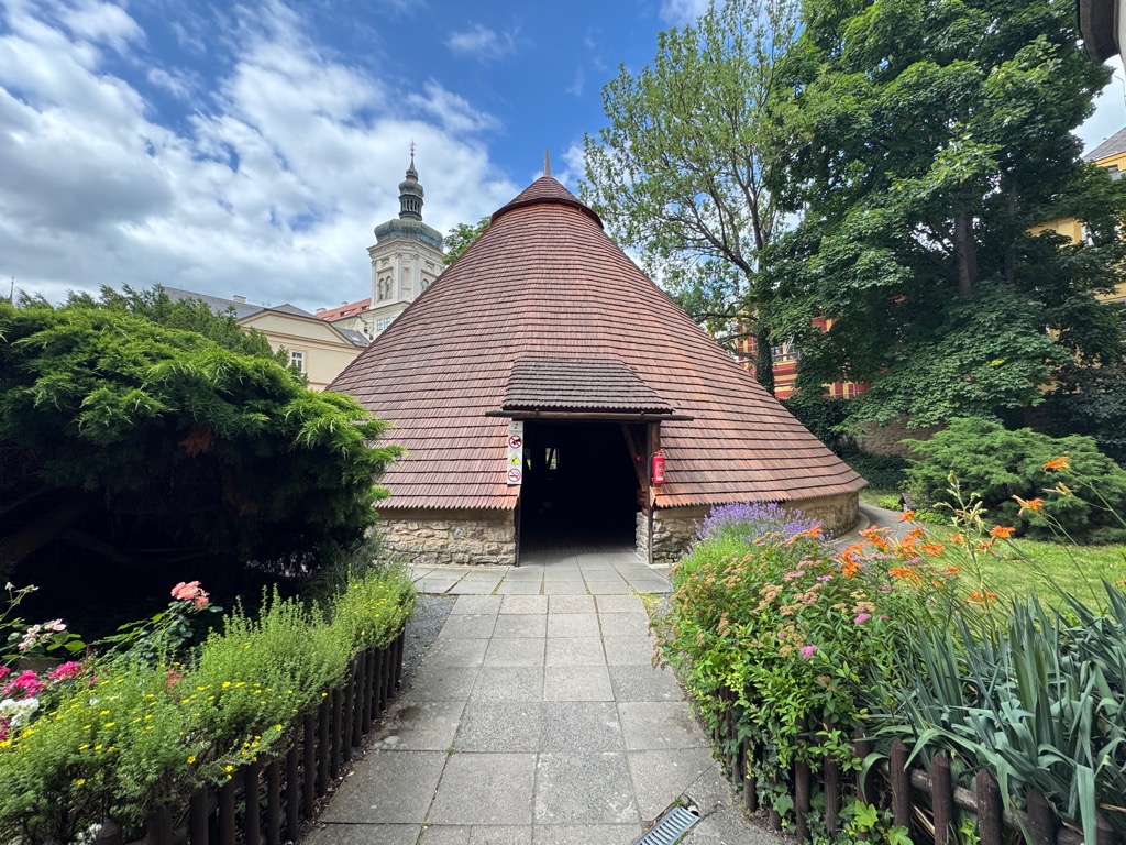 | Display at Kamenný dum (Stone House). Bottom left: Banner of the Millers’ Guild. Bottom right: Banner of the Butchers’ Guild. The latter matches the grocer’s guild in the game. |