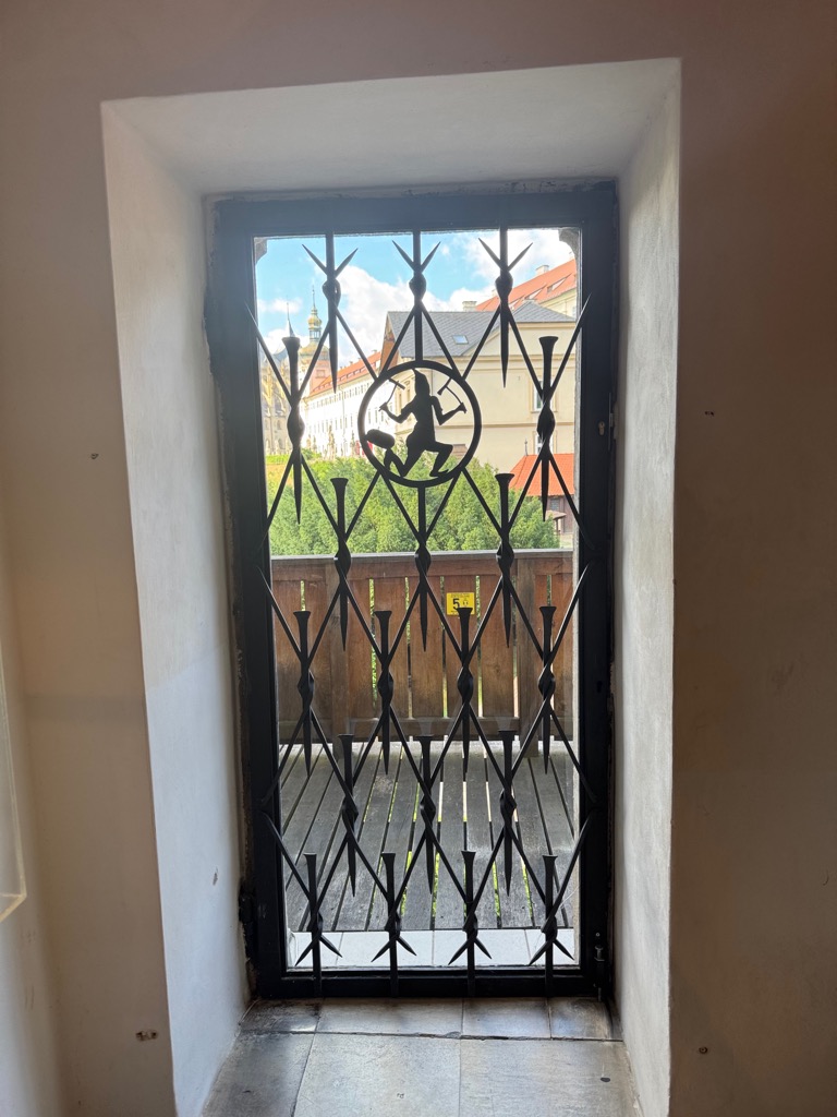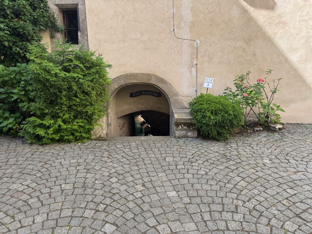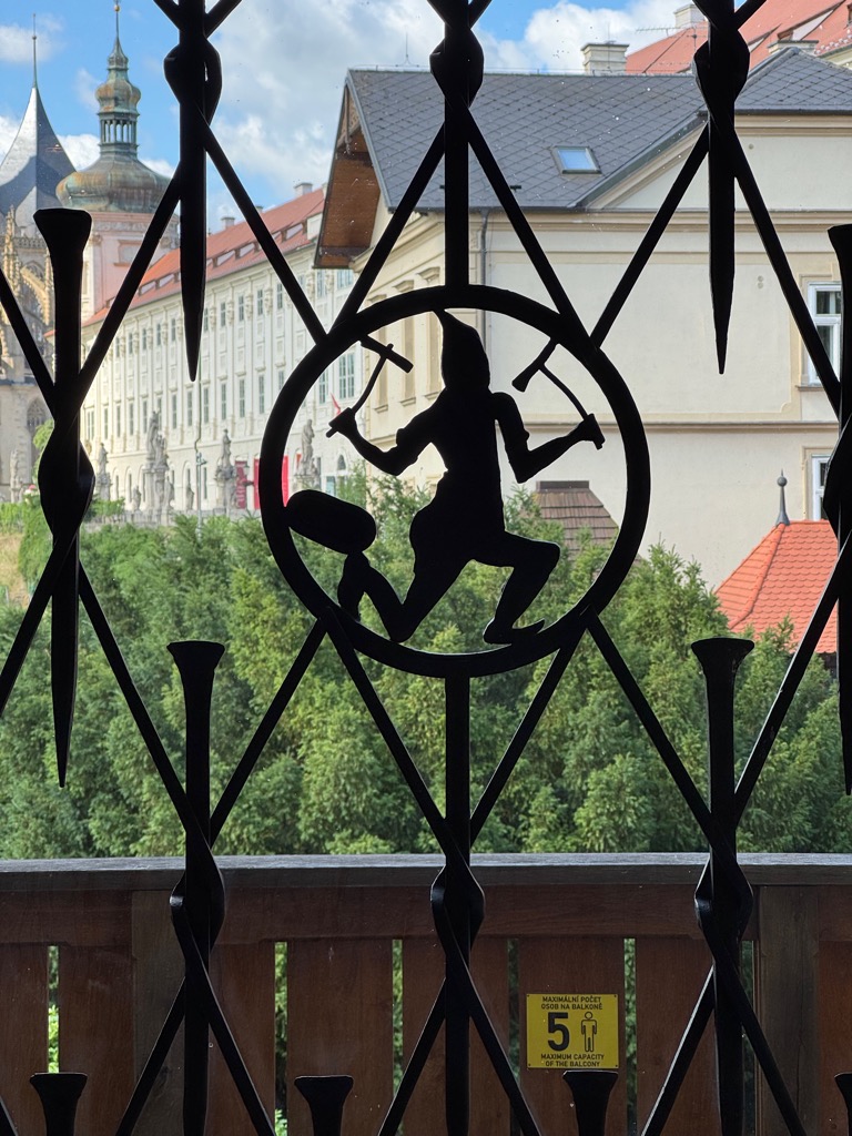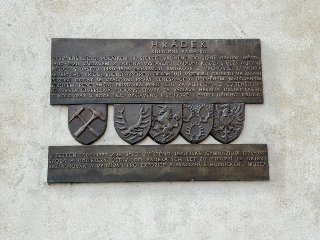 | Sign on Hrádek (little castle) with crests. That miner’s guild crest on the left matches one in the game. |