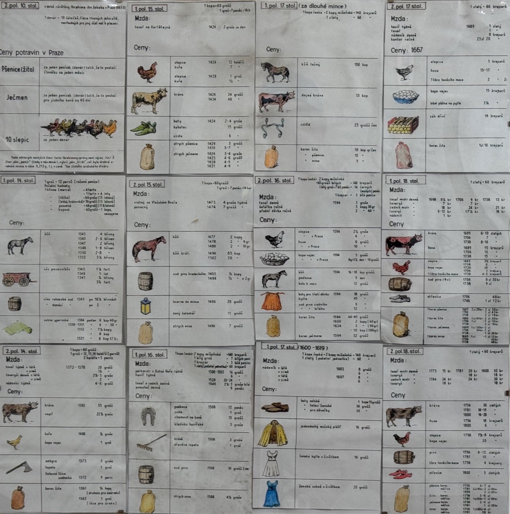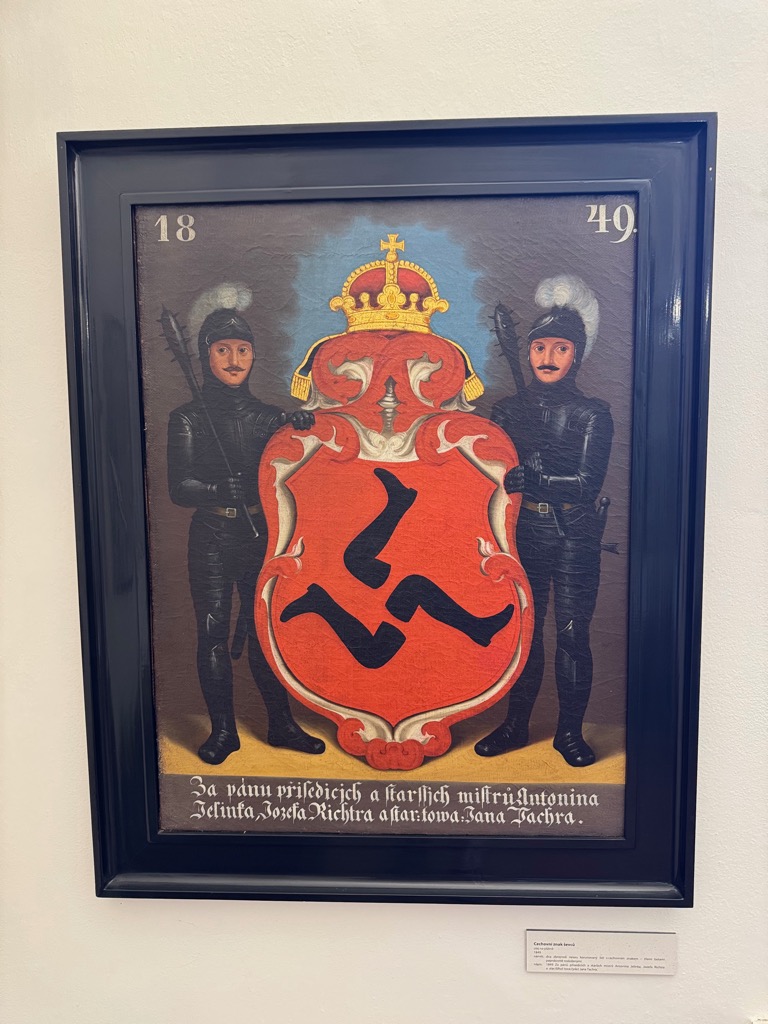 | Display at Kamenný dum (Stone House). Bottom left: Banner of the Millers’ Guild. Bottom right: Banner of the Butchers’ Guild. The latter matches the grocer’s guild in the game. |