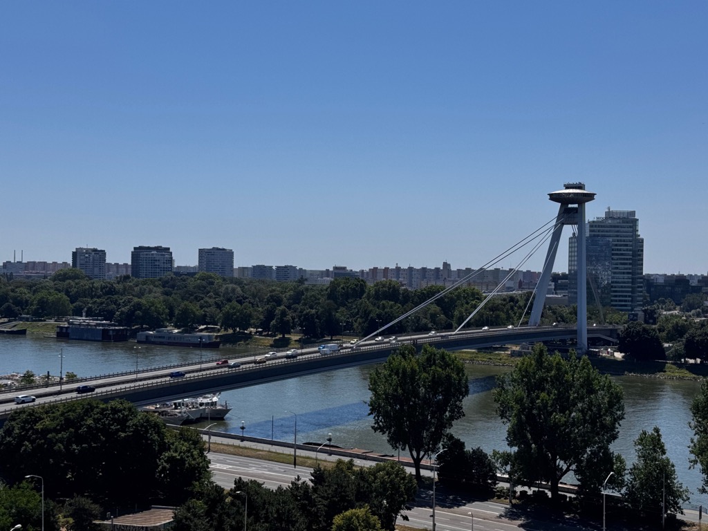 | Most SNP (Bridge of the Slovak National Uprising). The saucer-shaped structure at top is called the UFO. The bridge honors the 1944 resistance movement against the Nazis. |