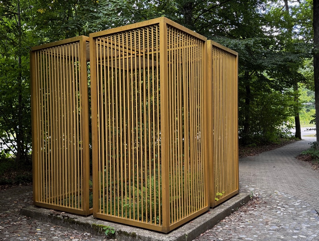 | Goldenes Käfige. I visited this spot 22 years ago. It is part of the Art Trail at the University of Ulm. I was hoping some tree or other plant would be thriving in its golden cage, but nope. |