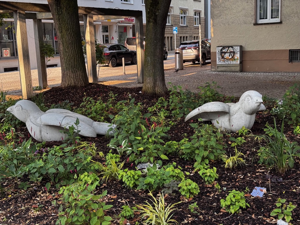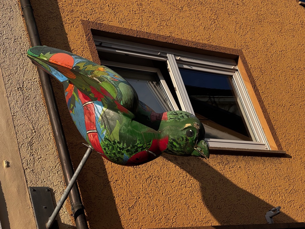 the sparrow sculptures that are still on display outside are aging and
